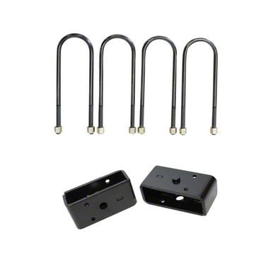Installation. Safely raise and support the rear axle, loosen and remove the factory U-bolts, insert the lift blocks between the axle perch and leaf spring pack (centering by pin), install the extended U-bolts and Nylock nuts, then torque to the manufacturer’s specifications.