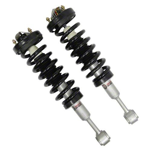Construction and Appearance. Each strut assembly includes brand new coil springs, hardened rubber bushings, and top mounts, ensuring long-lasting structural integrity. The 40mm piston is paired with a chromed hardened piston rod for increased resistance to wear and corrosion. These struts feature a clean, OE-style black finish that complements the undercarriage while resisting rust and road grime.