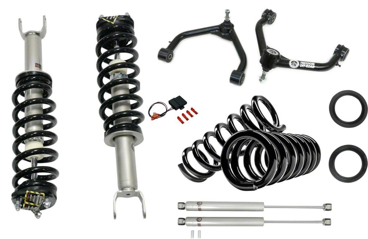 Reliable Air Ride Replacement With Added Lift. The Freedom Offroad 3-Inch Air Suspension Conversion Lift Kit with Front Upper Control Arms is engineered to replace the factory air ride system on your RAM 1500 while delivering improved reliability, ride height, and off-road capability. By eliminating the air suspension in favor of durable coil springs and shocks, this kit provides a consistent 3-inch lift and improves suspension performance for long-term use.