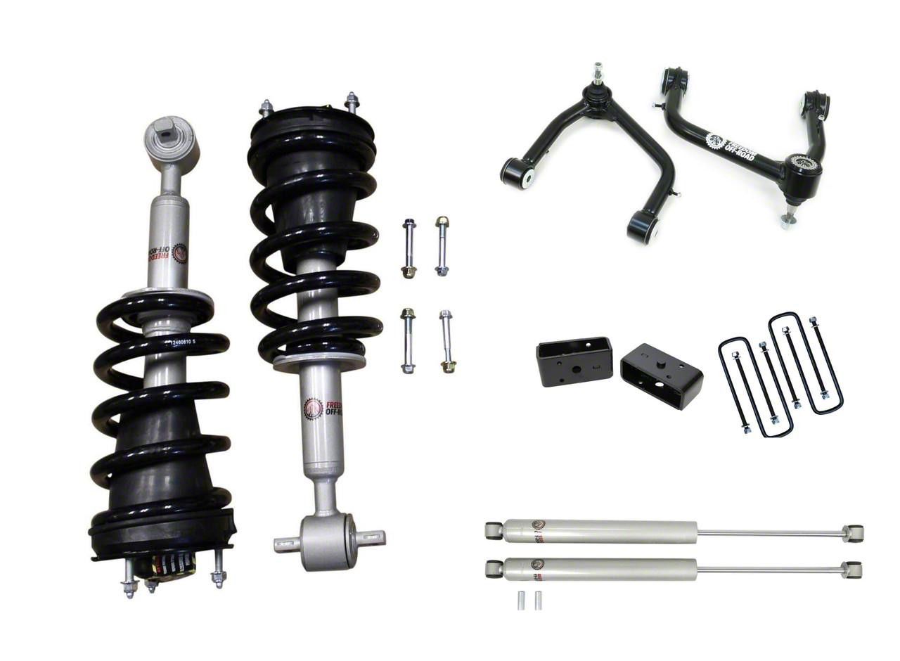 The Freedom Off-Road 3" front lift struts with 2" rear blocks, shocks, and front upper control arms provide a complete suspension upgrade designed to improve ride height, handling, and overall stance. The front lift struts come fully assembled for a simple bolt-on installation, delivering 3 inches of front lift while maintaining proper suspension geometry. Heavy-duty front upper control arms help correct alignment and improve ball joint angles after lifting. Rear 2" lift blocks help level the vehicle, while included rear shocks improve stability and control. Built for daily driving and off-road use, this kit delivers increased ground clearance, improved handling, and a more aggressive appearance without sacrificing ride quality.