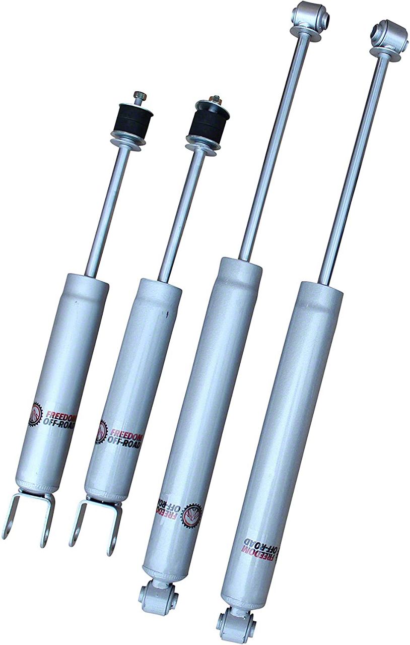 Set of 4 High pressure nitrogen charged shocks Designed for vehicles lifted 4-6" 40mm piston with chromed hardened piston rod Hardened rubber bushings Easy Bolt-on Installation