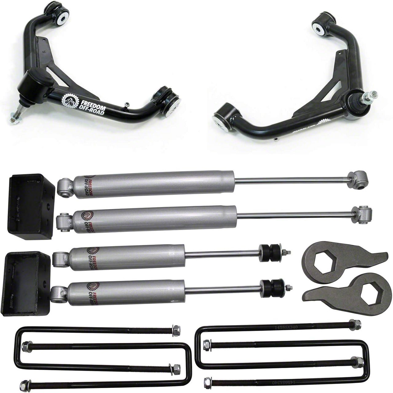 Application. This Freedom Offroad 1 to 3-Inch Front Torsion Key Leveling Kit with Control Arms and Shocks fits all 2001-2006 GMC Sierra 3500 HD Models. It enhances vehicle stability while providing improved ground clearance for better off-road handling.