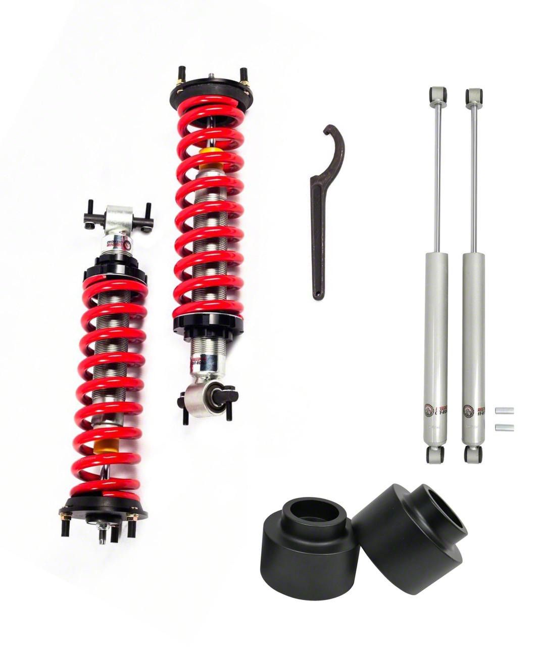 Adjustable Suspension Upgrade. The Freedom Offroad 1 to 4-Inch Adjustable Front Coil-Overs with 2-Inch Rear Spring Spacers and Shocks provide a comprehensive solution to enhance vehicle stance and performance. This suspension kit allows precise front ride height adjustments while the rear spacers help level the vehicle, improving ground clearance and handling for both on- and off-road use.