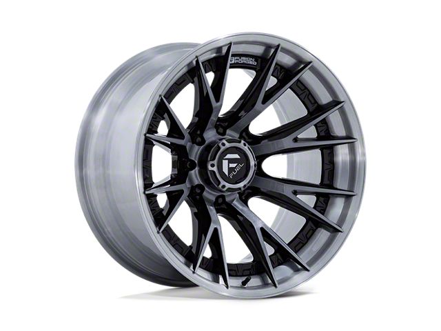 Fuel Wheels Catalyst Gloss Black with Brushed Gray Tint Face and Lip 8-Lug Wheel; 20x10; -18mm Offset is a perfect blend of style and rugged design, making it a standout choice for those looking to enhance their vehicle's aesthetic appeal. Its bold, dark metallic finish pairs seamlessly with a wide variety of vehicle styles, offering both modernity and durability. Built by Fuel Wheels, this wheel is designed to elevate your vehicle's appearance with its robust presence.