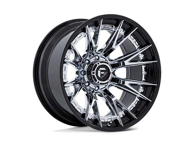 Fuel Wheels Catalyst Chrome with Gloss Black Lip 8-Lug Wheel; 20x9; 1mm Offset is a perfect blend of style and rugged design, making it a standout choice for those looking to enhance their vehicle's aesthetic appeal. Its bold, dark metallic finish pairs seamlessly with a wide variety of vehicle styles, offering both modernity and durability. Built by Fuel Wheels, this wheel is designed to elevate your vehicle's appearance with its robust presence.