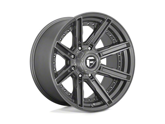 Fuel Wheels Rogue Platinum Brushed Gunmetal Tinted Clear 8-Lug Wheel; 20x10; -18mm Offset is a perfect blend of style and rugged design, making it a standout choice for those looking to enhance their vehicle's aesthetic appeal. Its bold, dark metallic finish pairs seamlessly with a wide variety of vehicle styles, offering both modernity and durability. Built by Fuel Wheels, this wheel is designed to elevate your vehicle's appearance with its robust presence.