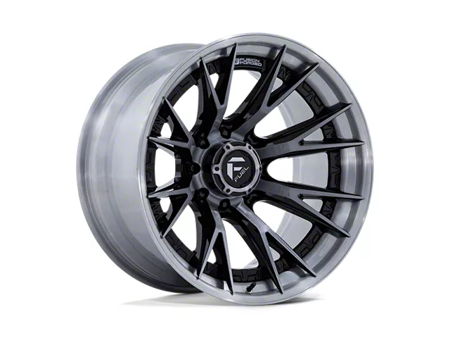 Fuel Wheels Catalyst Gloss Black with Brushed Gray Tint Face and Lip 8-Lug Wheel; 20x10; -18mm Offset is a perfect blend of style and rugged design, making it a standout choice for those looking to enhance their vehicle's aesthetic appeal. Its bold, dark metallic finish pairs seamlessly with a wide variety of vehicle styles, offering both modernity and durability. Built by Fuel Wheels, this wheel is designed to elevate your vehicle's appearance with its robust presence.
