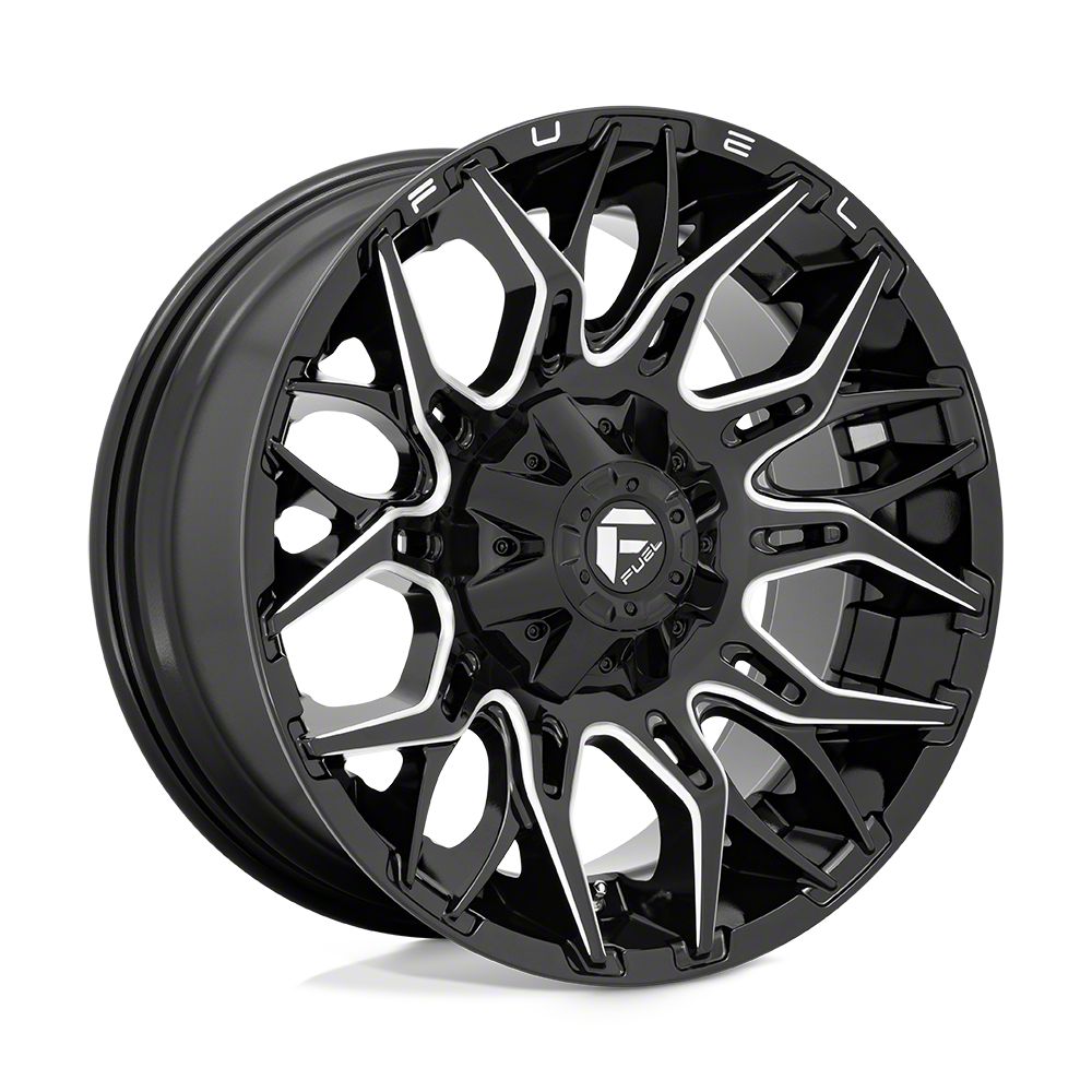 Application. This Fuel Wheels Twitch Glossy Black Milled 8-Lug Wheel; 20x9; 1mm Offset, with a backspacing of 5.039 Inch, 128mm and a bolt pattern of 8 x 165.1mm (8 x 6.5-Inch), is designed to fit 2010-2018 models. Sold individually.