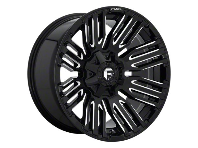 Fuel Wheels Schism Gloss Black Milled 8-Lug Wheel; 20x10; -18mm Offset is a perfect blend of style and rugged design, making it a standout choice for those looking to enhance their vehicle's aesthetic appeal. Its bold, dark metallic finish pairs seamlessly with a wide variety of vehicle styles, offering both modernity and durability. Built by Fuel Wheels, this wheel is designed to elevate your vehicle's appearance with its robust presence.