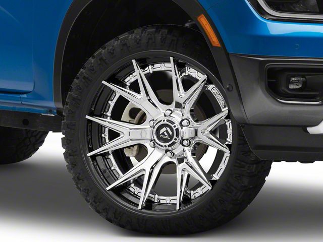 Application. This Fuel Wheels wheel, Fusion Forged Catalyst Chrome with Gloss Black Lip 6-Lug Wheel; 24x12; -44mm Offset, features a backspace of 4.768 Inch, 121.1mm and a bolt pattern of 6 x 139.7mm . These specifications help ensure proper wheel alignment and enhance driving stability. It is designed to fit the 2024-2026 Ranger models. Sold individually.