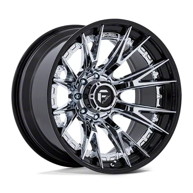 Fuel Wheels Catalyst Chrome with Gloss Black Lip 8-Lug Wheel; 24x12; -44mm Offset is a perfect blend of style and rugged design, making it a standout choice for those looking to enhance their vehicle's aesthetic appeal. Its bold, dark metallic finish pairs seamlessly with a wide variety of vehicle styles, offering both modernity and durability. Built by Fuel Wheels, this wheel is designed to elevate your vehicle's appearance with its robust presence.