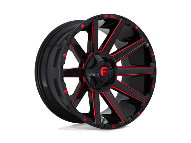 Fuel Wheels Contra Gloss Black with Red Tint Clear 8-Lug Wheel; 22x10; -18mm Offset exudes a sleek aesthetic appeal, complementing a range of vehicle styles. Its dark stainless finish emanates sophistication, while the brand reputation of Fuel Wheels ensures robustness. This wheel seamlessly merges elegance with durability.