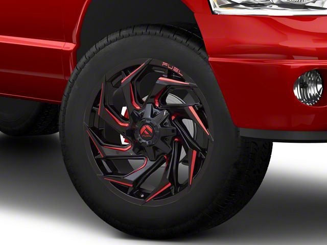 Fuel Wheels Reaction Gloss Black Milled with Red Tint 8-Lug Wheel; 20x9; 20mm Offset. Enhance your vehicle's look with the Fuel Wheels Reaction Gloss Black Milled with Red Tint 8-Lug Wheel. This premium wheel adds a touch of elegance and class to your vehicle, complementing its sophisticated aesthetic.