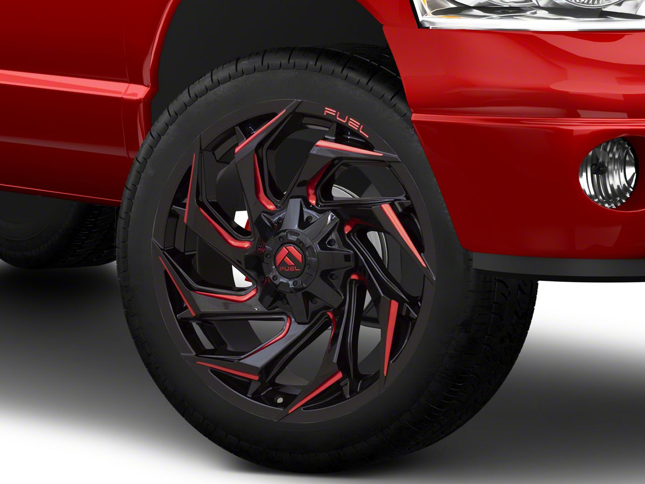 Fuel Wheels Reaction Gloss Black Milled with Red Tint 8-Lug Wheel; 22x10; -18mm Offset The Fuel Wheels Reaction Gloss Black Milled with Red Tint 8-Lug Wheel combines a sleek, sophisticated design with premium construction that enhances the visual appeal and complements a wide range of vehicle styles. This wheel is perfect for those seeking to make a bold statement while maintaining elegance and robustness.
