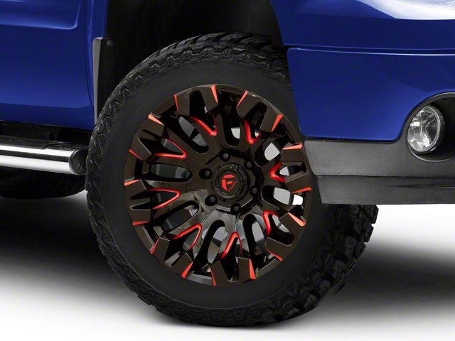 Fuel Wheels Quake Gloss Black Milled with Red Tint 6-Lug Wheel; 20x9; 1mm Offset: Redefine your vehicle's style with the Fuel Wheels Quake Gloss Black Milled with Red Tint 6-Lug Wheel. This wheel's elegant design and striking finish embody a blend of sophistication and boldness, perfectly complementing a wide array of vehicle aesthetics. Crafted from high-quality materials, it's a testament to durability and style.