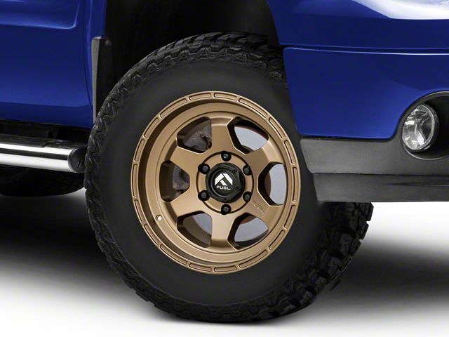 Fuel Wheels Shok Matte Bronze 6-Lug Wheel; 17x10; -18mm Offset exudes sophistication with its finish, offering a sleek and modern appeal to any vehicle it adorns. The design is meticulously crafted to enhance the aesthetic of your vehicle, giving it a distinctive and upscale look. Perfect for those seeking to elevate their vehicle's style, this wheel blends seamlessly with both contemporary and classic vehicle designs, making it a versatile choice for a wide range of vehicles. Its robust construction ensures durability, making it a reliable choice for drivers who value both style and quality.