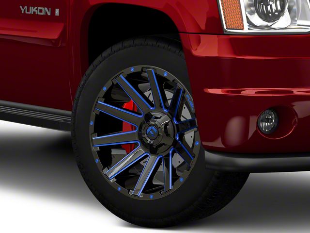 The 20x10 Fuel Wheels Contra Gloss Black with Blue Tinted Clear 6-Lug Wheel is painted in a stunning black hue, this wheel features a blue tint for an impressive head-turning presentation.
