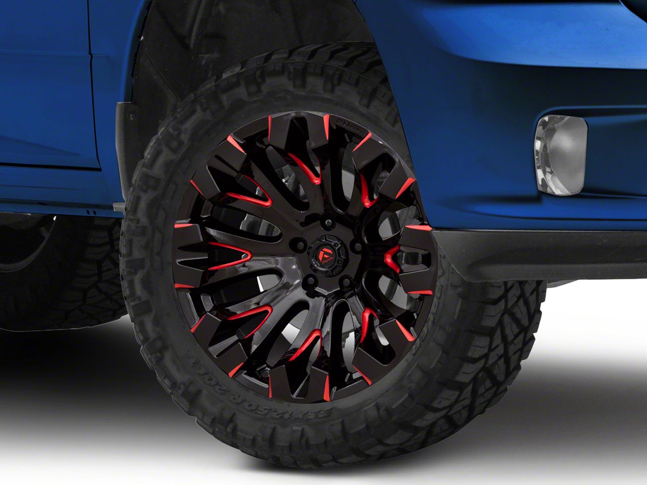 Fuel Wheels Quake Gloss Black Milled with Red Tint 5-Lug Wheel; 20x10; -18mm Offset The Fuel Wheels Quake Gloss Black Milled with Red Tint 5-Lug Wheel combines a sleek, sophisticated design with premium construction that enhances the visual appeal and complements a wide range of vehicle styles. This wheel is perfect for those seeking to make a bold statement while maintaining elegance and robustness.