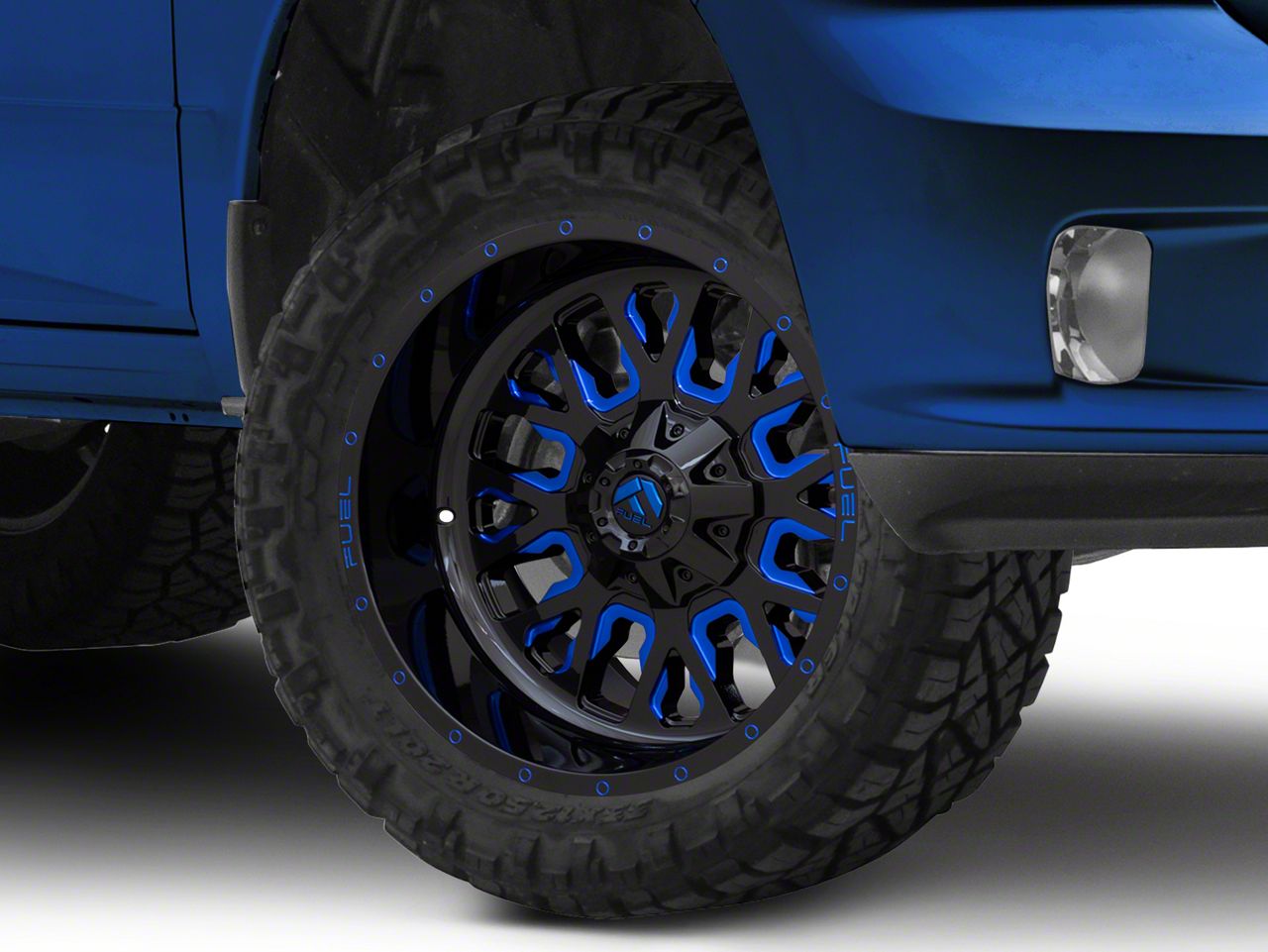 The 20x10 Fuel Wheels Stroke Gloss Black with Blue Tinted Clear 5-Lug Wheel is completed in a high-quality gloss black finish with blue accents for an aggressive appearance that will turn heads. This wheel features a durable clear coat that stands up to the hazards of everyday driving.
