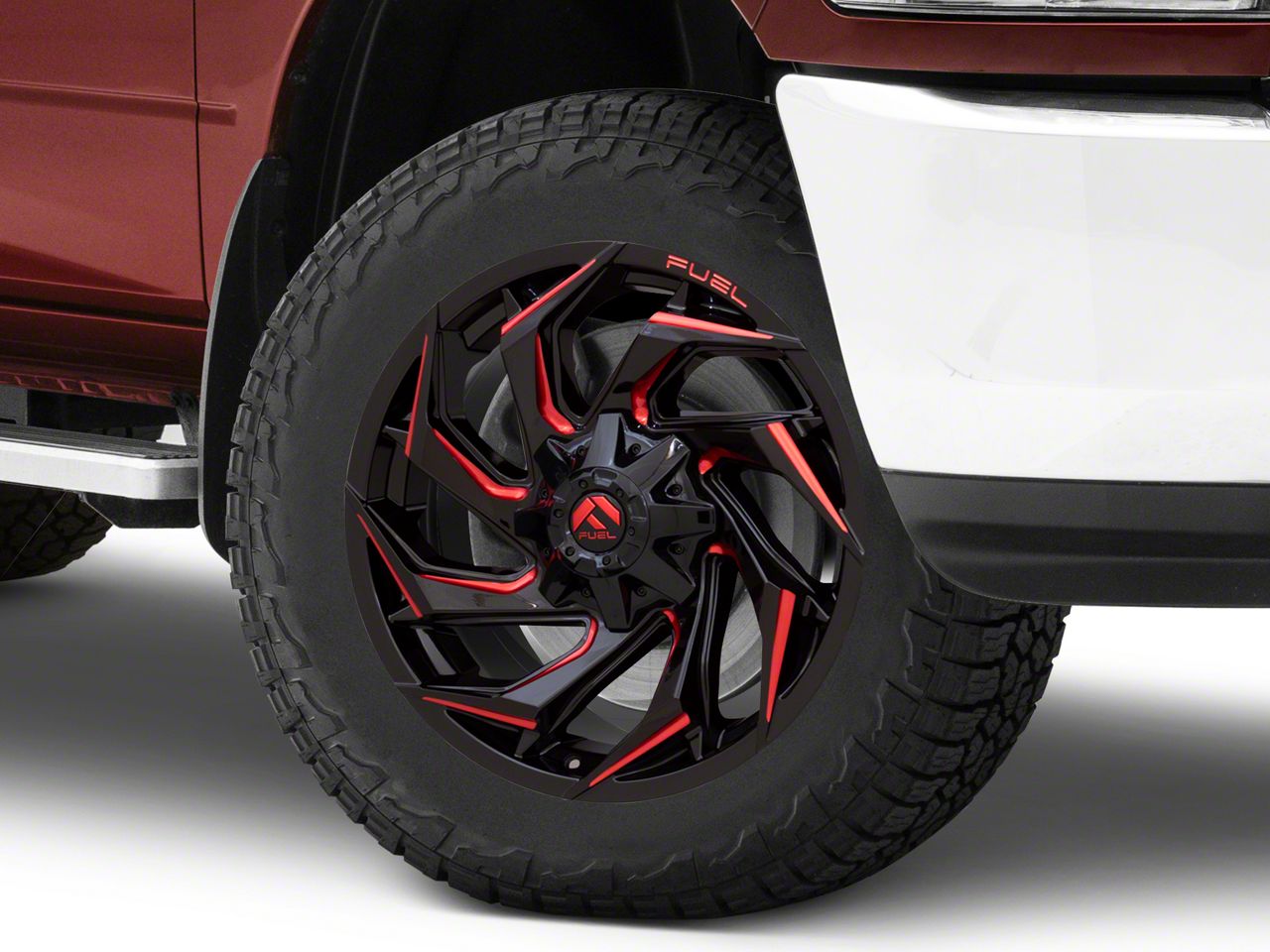 Fuel Wheels Reaction Gloss Black Milled with Red Tint 8-Lug Wheel; 20x10; -18mm Offset The Fuel Wheels Reaction Gloss Black Milled with Red Tint 8-Lug Wheel combines a sleek, sophisticated design with premium construction that enhances the visual appeal and complements a wide range of vehicle styles. This wheel is perfect for those seeking to make a bold statement while maintaining elegance and robustness.