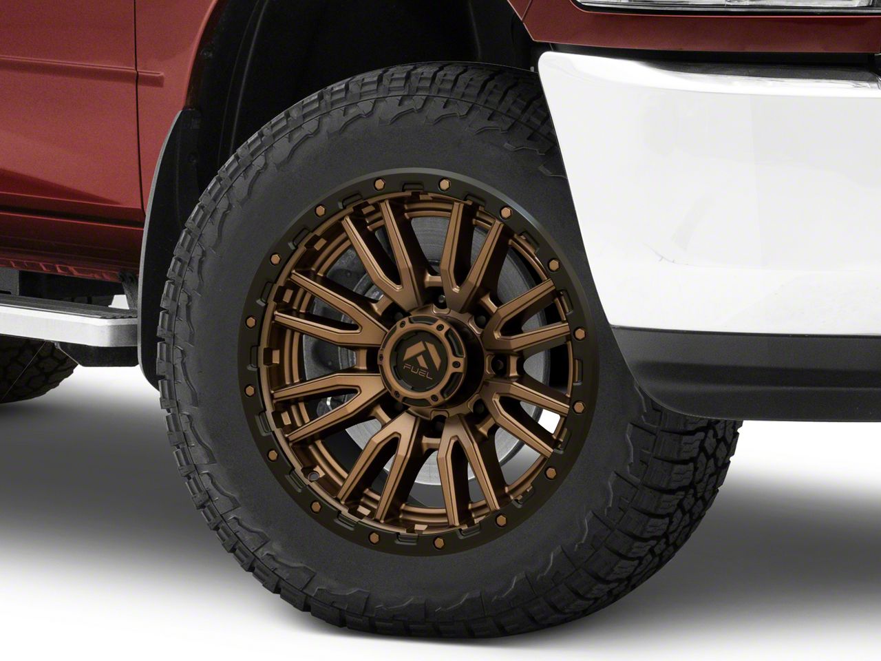 Application. This Fuel Wheels Rebel Matte Bronze 8-Lug Wheel; 20x9; 1mm Offset with a backspace of 5.04 Inch, 128.1mm; and bolt pattern of 8 x 165.1mm (8 x 6.5-Inch), contributes to alignment, driving stability, and ensures a perfect fit with the vehicle model. Designed to fit the 2010-2018 RAM 2500. Sold individually.