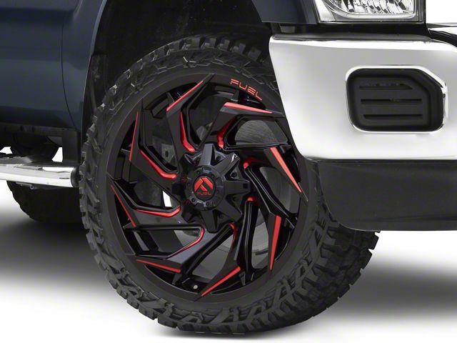 Fuel Wheels Reaction Gloss Black Milled with Red Tint 8-Lug Wheel; 24x12; -44mm Offset The Fuel Wheels Reaction Gloss Black Milled with Red Tint 8-Lug Wheel combines a sleek, sophisticated design with premium construction that enhances the visual appeal and complements a wide range of vehicle styles. This wheel is perfect for those seeking to make a bold statement while maintaining elegance and robustness.