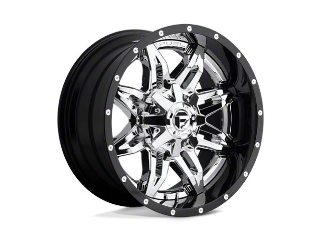 Fuel Wheels Lethal Chrome with Gloss Black Lip 6-Lug Wheel; 20x12; -44mm Offset The Fuel Wheels Lethal Chrome with Gloss Black Lip 6-Lug Wheel combines a sleek, sophisticated design with premium construction that enhances the visual appeal and complements a wide range of vehicle styles. This wheel is perfect for those seeking to make a bold statement while maintaining elegance and robustness.