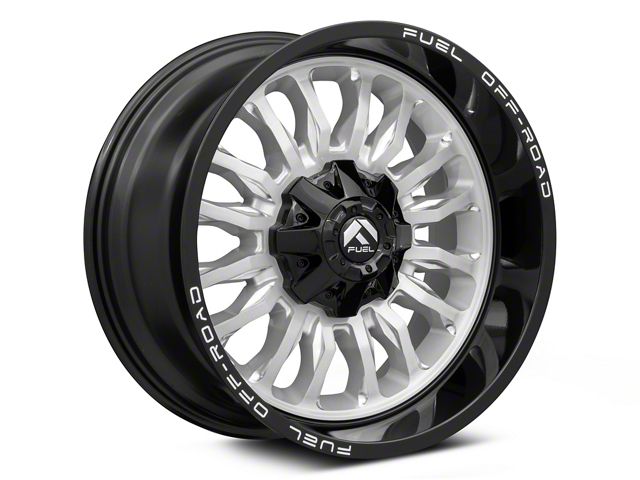 Fuel Wheels Arc Silver Brushed Face with Milled Black Lip 8-Lug Wheel; 22x10; -18mm Offset The Fuel Wheels Arc Silver Brushed Face with Milled Black Lip 8-Lug Wheel combines a sleek, sophisticated design with premium construction that enhances the visual appeal and complements a wide range of vehicle styles. This wheel is perfect for those seeking to make a bold statement while maintaining elegance and robustness.
