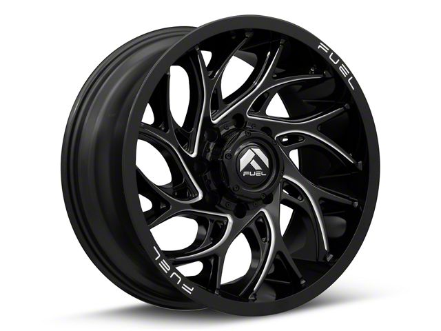 The 22x10 Fuel Wheels Runner Gloss Black Milled 8-Lug Wheel; 22x10; -18mm Offset is completed in a high quality, gloss black finish. The milled steel accents are where it really shines through. The accents make the split section of the spokes pop along the faux beadlock.