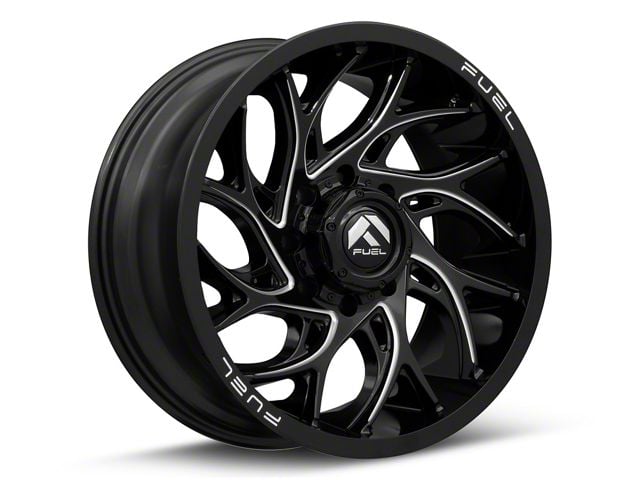 The 22x12 Fuel Wheels Runner Gloss Black Milled 8-Lug Wheel; 22x12; -44mm Offset is completed in a high quality, gloss black finish. The milled steel accents are where it really shines through. The accents make the split section of the spokes pop along the faux beadlock.