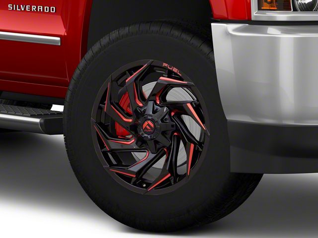 Fuel Wheels Reaction Gloss Black Milled with Red Tint 8-Lug Wheel; 20x9; 20mm Offset The Fuel Wheels Reaction Gloss Black Milled with Red Tint 8-Lug Wheel combines a sleek, sophisticated design with premium construction that enhances the visual appeal and complements a wide range of vehicle styles. This wheel is perfect for those seeking to make a bold statement while maintaining elegance and robustness.