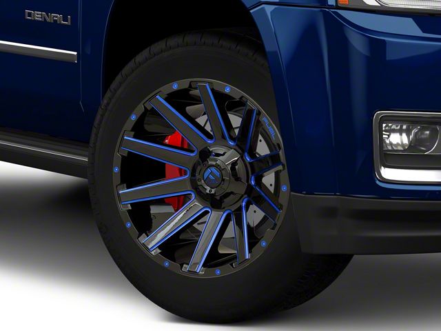 The 20x9 Fuel Wheels Contra Gloss Black with Blue Tinted Clear 6-Lug Wheel is painted in a stunning black hue, and features blue accents for an impressive head-turning presentation.