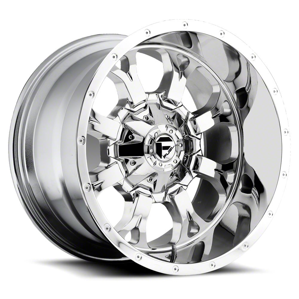 The 20x10 Fuel Wheels Krank Chrome 8-Lug Wheel has a chrome finish that is accomplished in a 3-step plating process that includes copper, nickel and chrome.