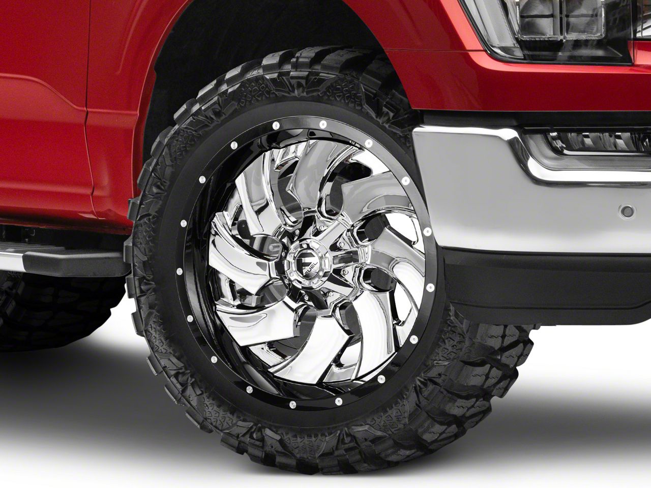 Application. This Fuel Wheels Cleaver Chrome with Gloss Black 6-Lug Wheel; 22x10; -13mm Offset with a backspace of 4.989 Inch, 126.8mm and bolt pattern of 6 x 135mm (6 x 5.31-Inch) is meticulously engineered to enhance alignment and driving stability. It is designed to fit 2021-2026 F-150 models. Sold individually.