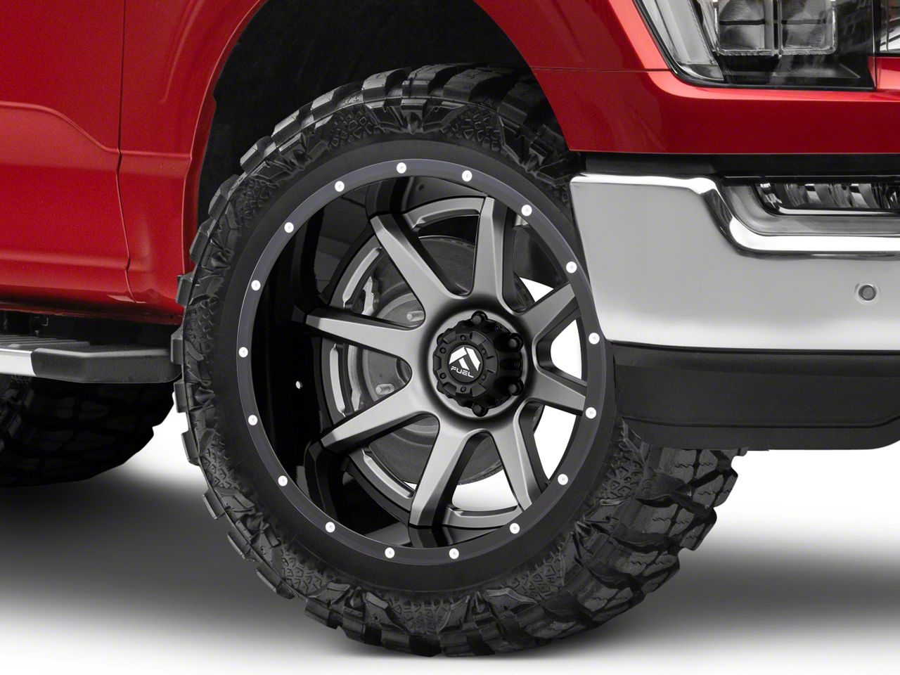 Application. This Fuel Wheels Rampage Gun Metal 6-Lug Wheel; 22x12; -44mm Offset with a backspace of 4.768 Inch, 121.2mm and bolt pattern of 6 x 135mm (6 x 5.31-Inch) ensures impeccable alignment and driving stability. It's designed to fit the 21-23 F-150 models, sold individually.