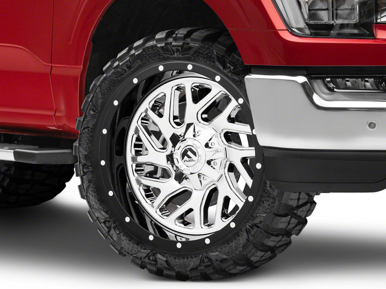 Application. This Fuel Wheels Triton Chrome with Gloss Black Lip 6-Lug Wheel; 22x10; -13mm Offset with a backspace of 4.989 Inch, 126.8mm and bolt pattern of 6 x 135mm (6 x 5.31-Inch) ensures impeccable alignment and driving stability. It's designed to fit the 21-23 F-150 models, sold individually.