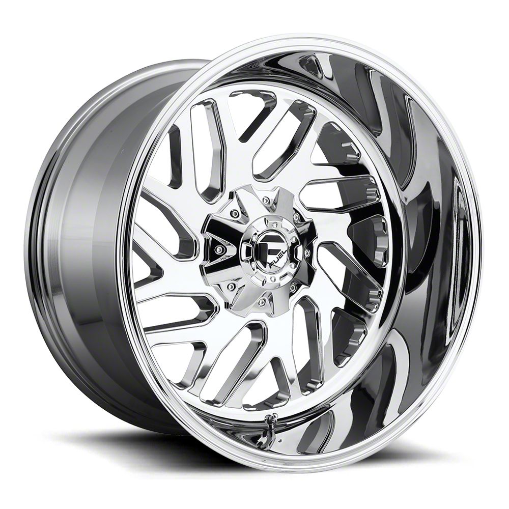 Fuel Wheels Triton Chrome 8-Lug Wheel; 20x10; -18mm Offset exudes a sleek aesthetic appeal, complementing a range of vehicle styles. Its dark stainless finish emanates sophistication, while the brand reputation of Fuel Wheels ensures robustness. This wheel seamlessly merges elegance with durability.