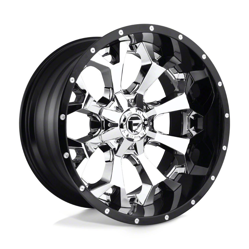 Fuel Wheels Assault Chrome with Gloss Black Lip 8-Lug Wheel; 20x10; -18mm Offset is a wheel that stands out with its refined design and precision finish, making it a perfect match for vehicles that demand a sophisticated yet aggressive appearance.