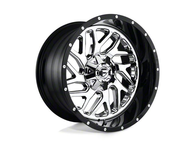 Fuel Wheels Triton Chrome with Gloss Black Lip 8-Lug Wheel; 20x10; -19mm Offset is a wheel that stands out with its refined design and precision finish, making it a perfect match for vehicles that demand a sophisticated yet aggressive appearance.