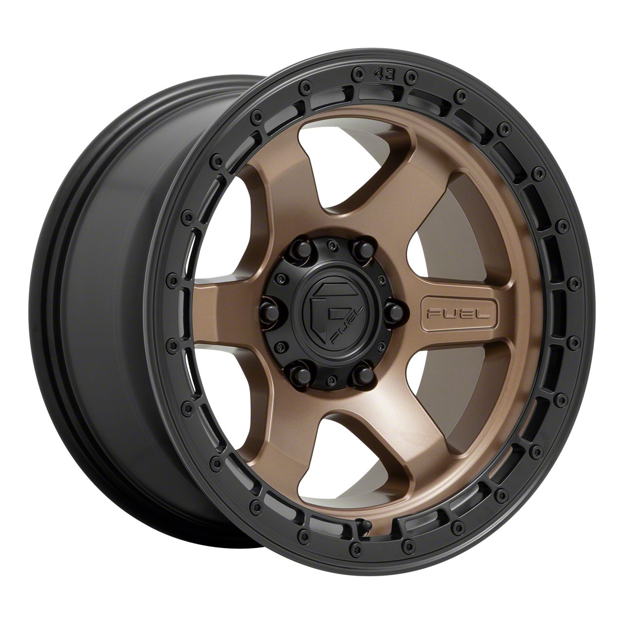 Fuel Wheels Block Matte Bronze with Black Ring 6-Lug Wheel; 18x9; 1mm Offset offers a striking balance between style and durability. The design speaks to the brand's commitment to quality, enhancing the vehicle's appearance with its distinct look. This wheel, with its unique aesthetics, is ideal for drivers who appreciate a blend of modern design and robust functionality.