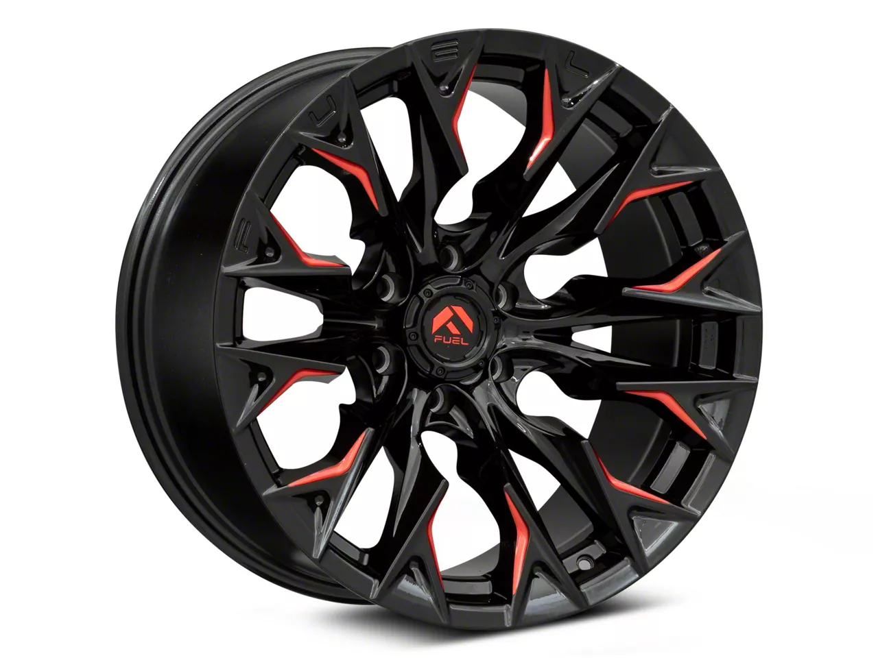 Fuel Wheels Flame Gloss Black Milled with Red Accents 6-Lug Wheel; 20x10 exudes an aesthetic allure that complements a range of vehicle styles. With its design rooted in Fuel Wheels craftsmanship, this wheel accentuates your vehicle's elegant stance.