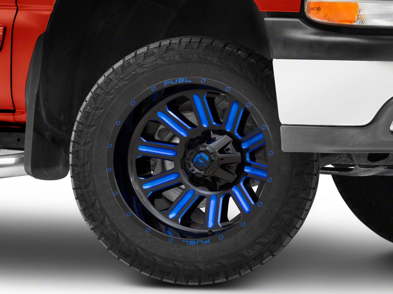 The 20x10 Fuel Wheels Hardline Gloss Black with Blue Tinted Clear 6-Lug Wheel is painted in a stunning black hue, this wheel features a blue tint for an impressive head-turning presentation.