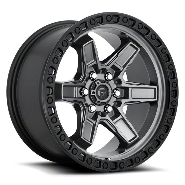 Fuel Wheels Kicker Matte Gunmetal with Black Bead Ring 6-Lug Wheel; 17x9; -12mm Offset. The Fuel Wheels Kicker Matte Gunmetal with Black Bead Ring 6-Lug Wheel offers a striking balance of style and refinement. Its unique design accentuates the vehicle's aesthetic, while the premium construction underscores its robust nature. This wheel is a perfect choice for those seeking both elegance and a strong visual statement.