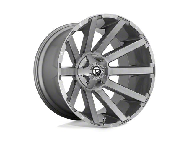 The 20x10 Fuel Wheels Contra Platinum Brushed Gunmetal with Tinted Clear 5-Lug Wheel is completed in a high-quality brushed gunmetal finish with contrasting accents for an aggressive appearance that will turn heads. This wheel features a durable clear coat that stands up to the hazards of everyday driving.