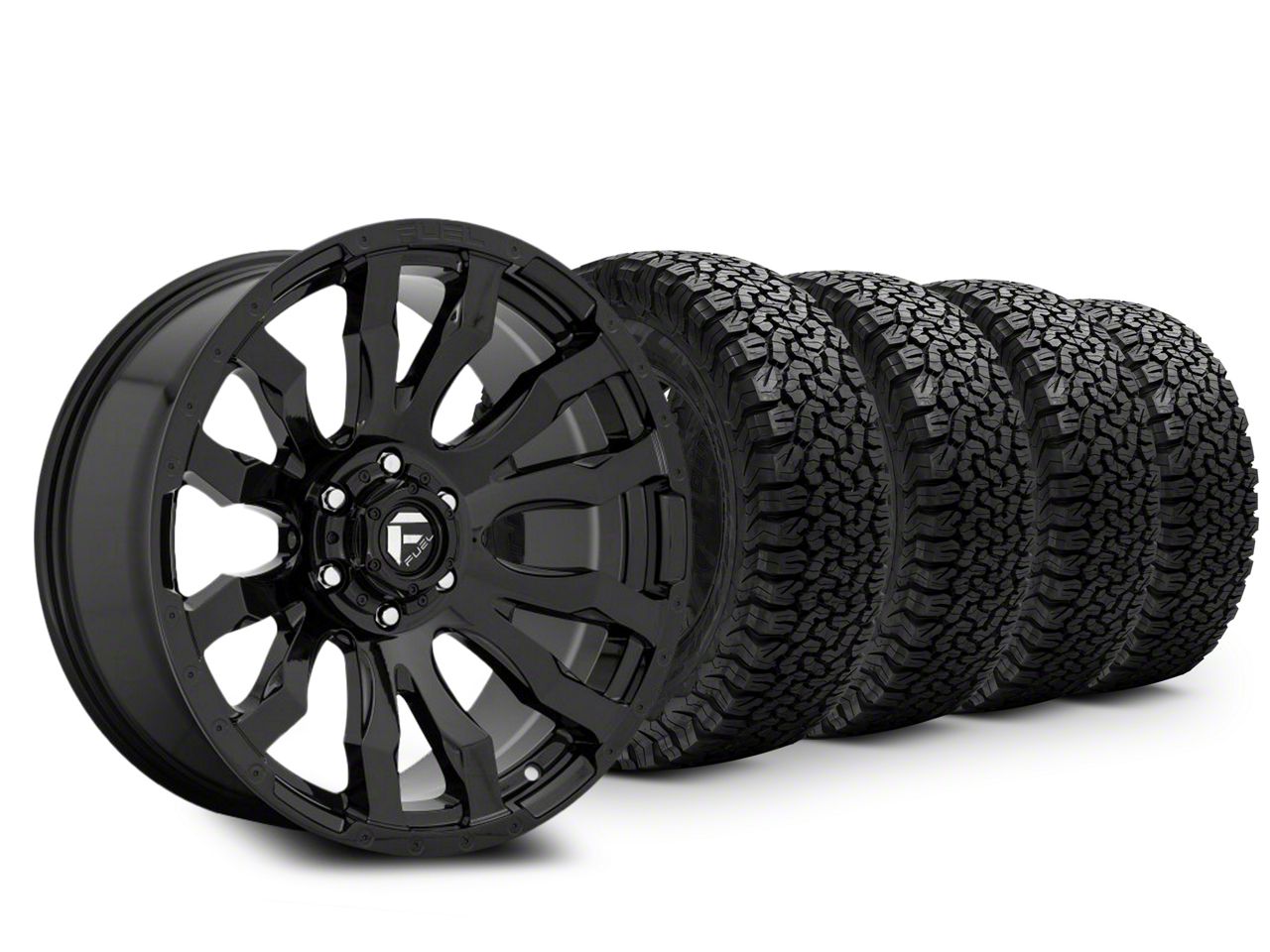 Mounted and Balanced Wheel and Tire Kit. This wheel and tire combo kit features (4) 20x9 Fuel Wheels Blitz Gloss Black 6-Lug Wheels and (4) BF Goodrich All-Terrain T/A KO 275/60R20 tires that have been put together into an easy to buy kit that arrives to your door already mounted and balanced ready to be installed on your vehicle.