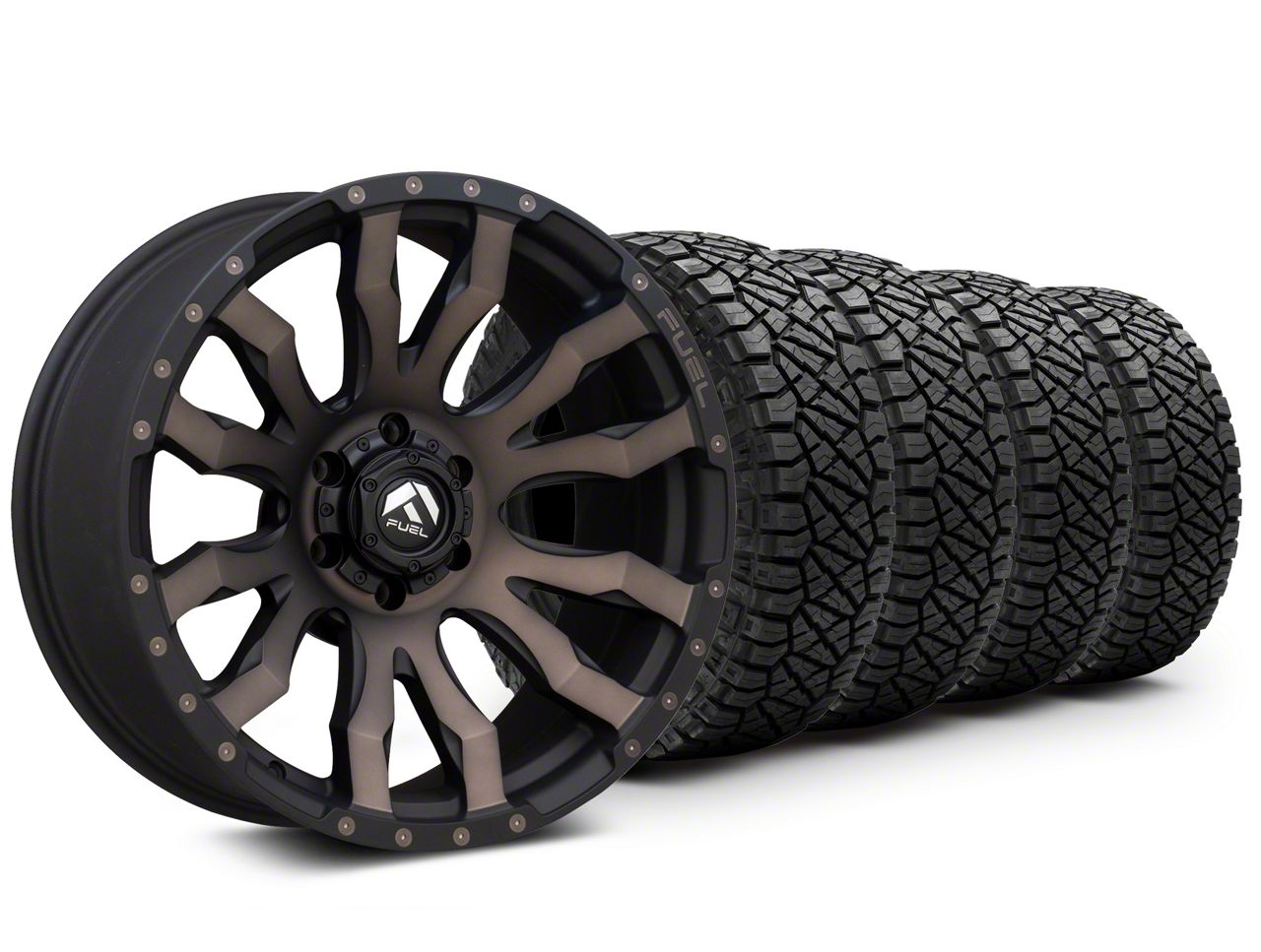 Mounted and Balanced Wheel and Tire Kit. This wheel and tire combo kit features (4) 20x9 Fuel Wheels Blitz Matte Black with Double Dark Tint 6-Lug Wheels and (4) NITTO All-Terrain Ridge Grappler A/T 33x12.50R20 tires that have been put together into an easy to buy kit that arrives to your door already mounted and balanced ready to be installed on your vehicle.