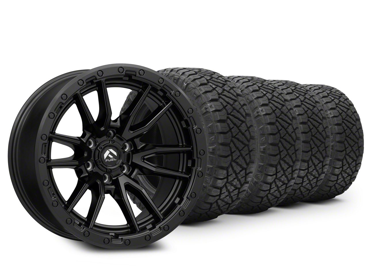 Mounted and Balanced Wheel and Tire Kit. This wheel and tire combo kit features (4) 20x10 Fuel Wheels Rebel Matte Black 6-Lug Wheels and (4) NITTO All-Terrain Ridge Grappler A/T 33" - 33x12.50R20 tires that have been put together into an easy to buy kit that arrives to your door already mounted and balanced ready to be installed on your vehicle.