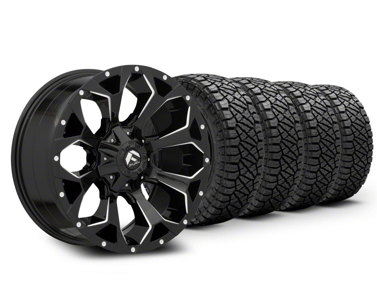 Mounted and Balanced Wheel and Tire Kit. This wheel and tire combo kit features (4) 20x9 Fuel Wheels Assault Gloss Black Wheels and (4) NITTO Recon Grappler A/T 32" - 275/55R20 tires that have been put together into an easy to buy kit that arrives to your door already mounted and balanced ready to be installed on your vehicle.