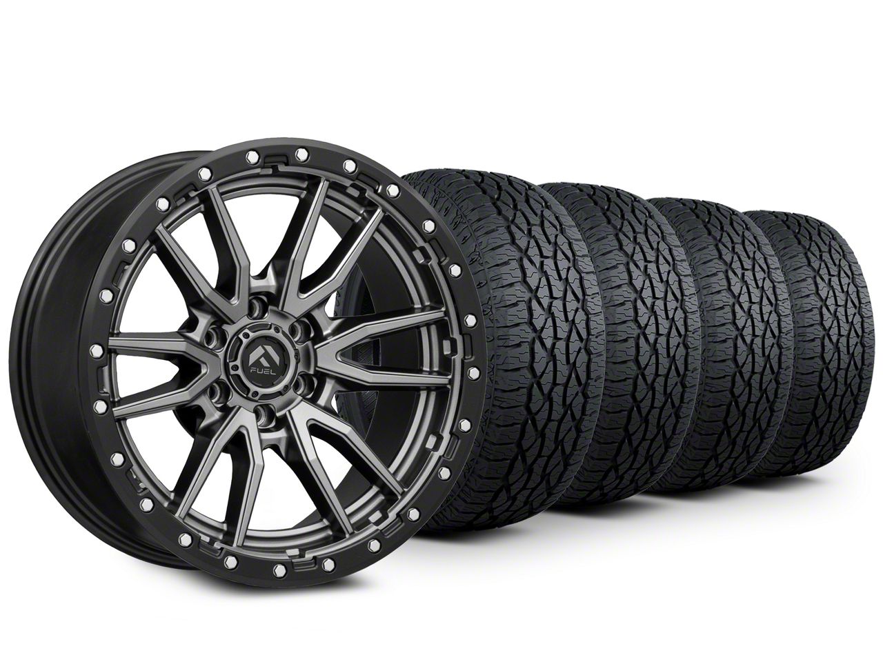 Matte Gunmetal with Black Simulated Bead Ring Wheels. Fuel's Rebel Series Wheel features an impressive V-spoke design with simulated bead lock bolts around the lip for rugged good looks. This Fuel Wheel is completed in a high quality, clear coated, matte gunmetal gray finish for an aggressive appearance that can withstand the hazards of everyday driving - including road chips and pitting.