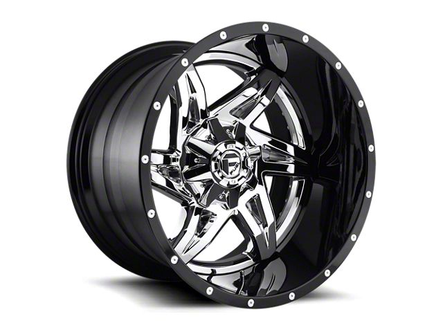 Fuel Wheels Rocker Chrome with Gloss Black Lip 8-Lug Wheel; 22x10; -13mm Offset The Fuel Wheels Rocker Chrome with Gloss Black Lip 8-Lug Wheel combines a sleek, sophisticated design with premium construction that enhances the visual appeal and complements a wide range of vehicle styles. This wheel is perfect for those seeking to make a bold statement while maintaining elegance and robustness.